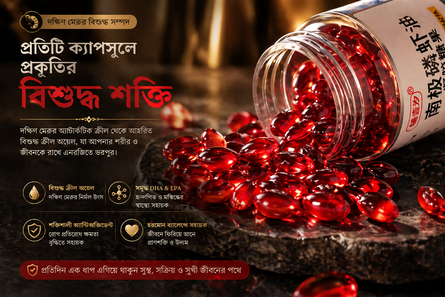 শুধু একটি সাপ্লিমেন্ট নয় — প্রিমিয়াম অ্যান্টার্কটিক উৎস থেকে তৈরি প্রতিটি সফটজেল আপনার দৈনন্দিন পুষ্টির স্মার্ট সমাধান। DHA, EPA এবং প্রাকৃতিক অ্যান্টিঅক্সিডেন্টের নিখুঁত মিশ্রণ।